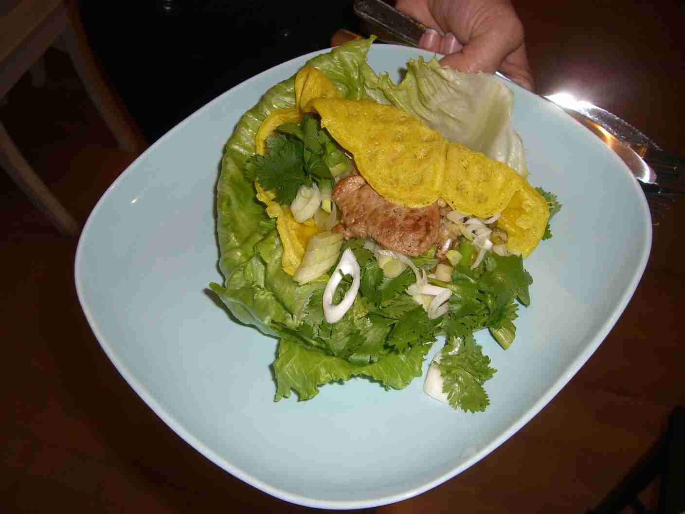 Bánh xèo, vietnamesische Pfannkuchen mit Mungobohnen, Fleisch, Garnelen und Gemüse.